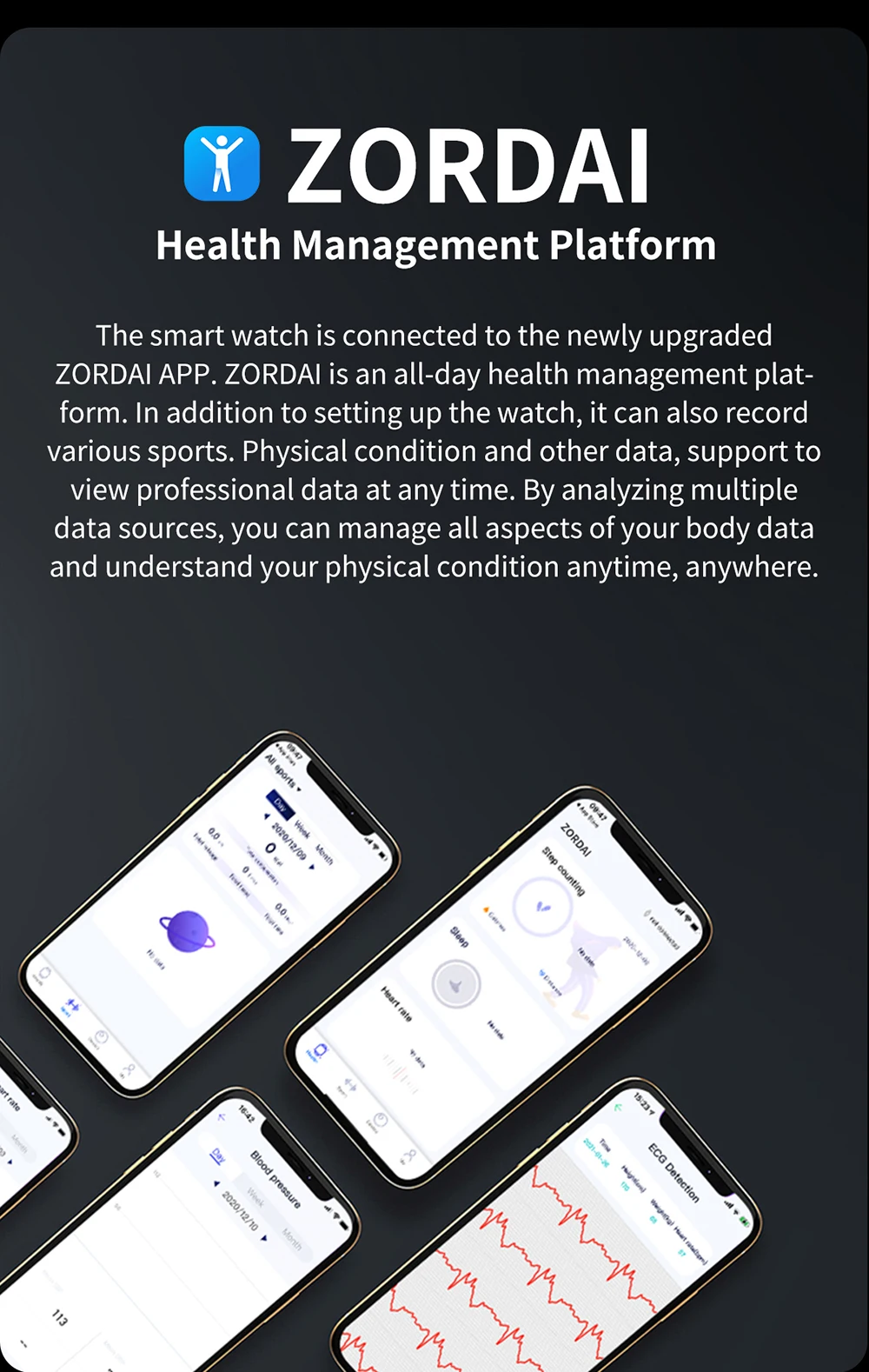 The smart watch is connected to the newly upgraded ZORDAI APP. ZORDAI is an all-day health management plat- form. In addition to setting up the watch, it can also record various sports. Physical condition and other data, support to view professional data at any time. By analyzing multiple data sources, you can manage all aspects of your body data and understand your physical condition anytime, anywhere.